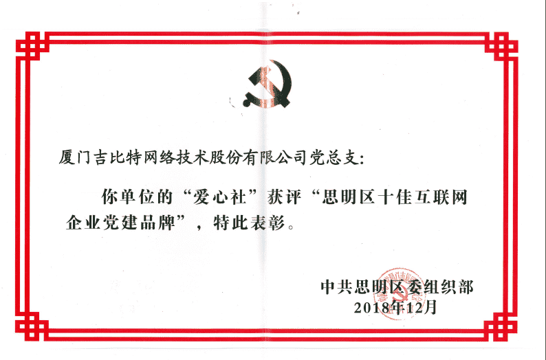 经初审评选、、、网络评选和专家评审等环节,,,"厦门J9.COM网络技术股份有限公司党总支-爱心社" 从全区28个参评党建品牌中脱颖而出,,,,获评"思明区十佳互联网企业党建品牌"。。